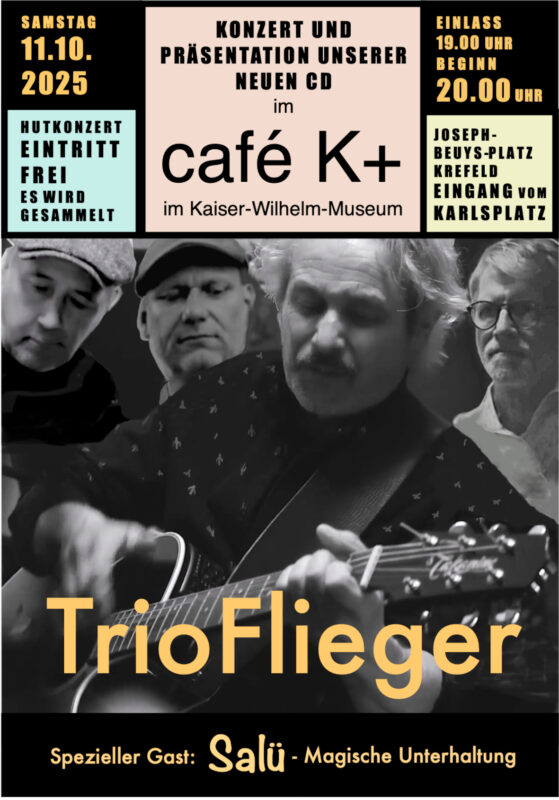 Man kann die Seele nicht anfassen, aber man kann sie berühren – genau das geschieht bei den Konzerten der Band TRIOFLIEGER rund um den Sänger und Gitarristen Frank Flieger, der alle Lieder und Songs selbst komponiert und getextet hat. Die Basisgruppe bilden die erfahrenen Musiker Klaus Wilke (Akustik-Gitarre), Eddie Köller (Akustik-Bass) und Joachim Watzlawick (Perkussion), denen die Musik im Blut und am Herzen liegt. Wann immer es möglich ist, bereichert Sven Rossenbach die Gruppe durch sein außergewöhnliches Saxophonspiel. Musikalisch lässt sich die Band in keine Schublade packen. Die Lieder und Songs bedienen sich hemmungslos aus sämtlichen Bereichen der Pop-, Rock-, Jazz- und Folkmusik. Besonders sind auch die Texte der Songs, die in englischer und deutscher Sprache verfasst sind. Es sind Geschichten aus dem Leben, manchmal autobiografisch gefärbt. Und es sind Gedichte, welche die Diskrepanzen des Menschen in seinem sozialen und politischen Umfeld thematisieren. TRIOFLIEGER sind eine außergewöhnliche Musikgruppe mit einem unverwechselbaren eigenen Sound! Bei Live-Auftritten spürt das Publikum schnell die Leidenschaft, mit der die Musiker ihre Songs interpretieren. Und entsprechend heißt es im Refrain eines Liedes: „Alles, was das Glück uns gibt, ist uns einfach hinzugeben an das spielerische Leben. Einfach mit den Klängen treiben, ohne irgendwo zu bleiben, das ist Passion, das ist Musik.“